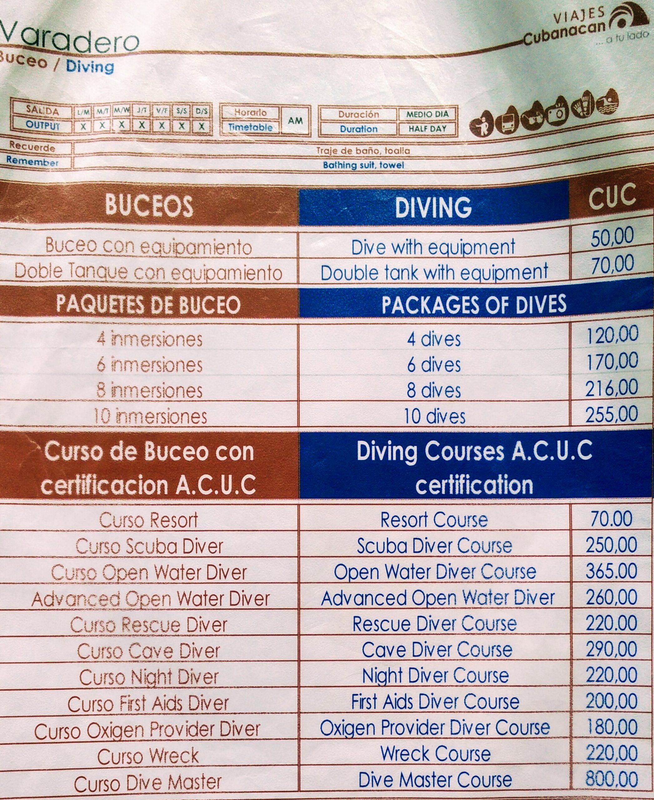 Prices Scuba Diving Varadero